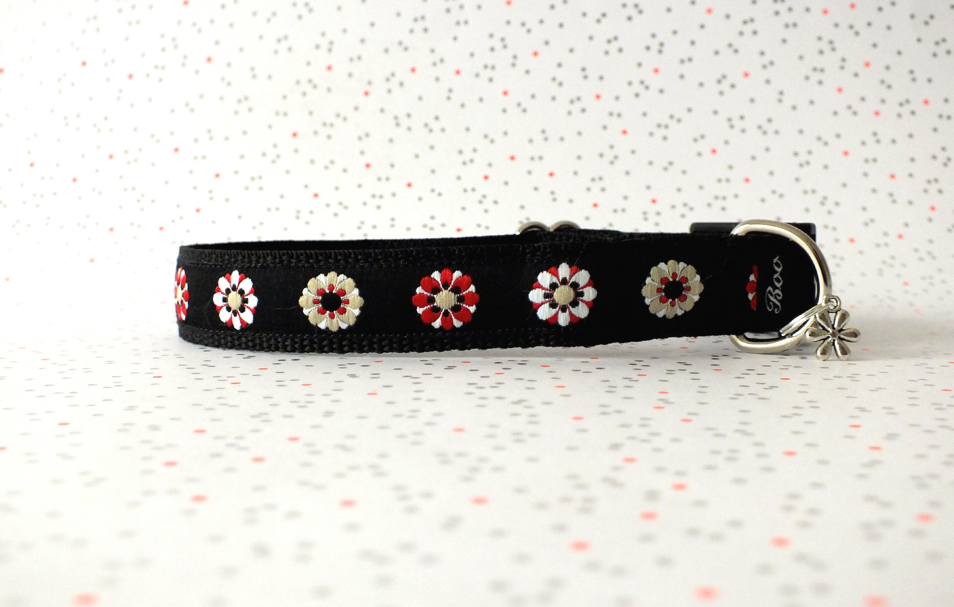 Das Halsband hat eine aufgenähte Webbordüre und eine samtig weiche Unterfütterung. Durch einen Metall Schieber ist es stufenlos größenverstellbar ohne am Hals zu verrutschen. Leicht gewölbt sorgt ein schwarzer Klickverschluss für einen guten Sitz am Hundehals. Der kleine Anhänger ist nur Tüddelkrams fürs Foto und könnte anders ausfallen. Das Material ist waschbar bis 30 Grad. Meine Empfehlung für dich ist Handwäsche um die tollen Farben und das Material zu schonen.