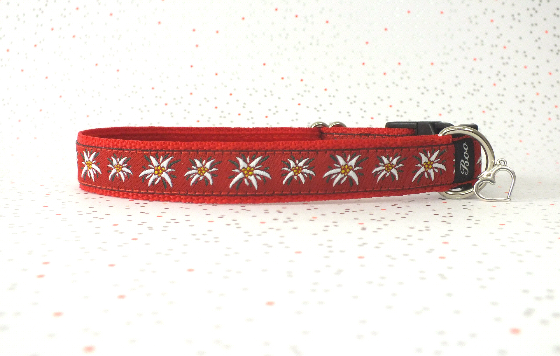 Das Halsband hat eine aufgenähte Webbordüre und eine samtig weiche Unterfütterung. Durch einen Metall Schieber ist es stufenlos größenverstellbar ohne am Hals zu verrutschen. Leicht gewölbt sorgt ein schwarzer Klickverschluss für einen guten Sitz am Hundehals. Der kleine Anhänger ist nur Tüddelkrams fürs Foto und könnte anders ausfallen. Das Material ist waschbar bis 30 Grad. Meine Empfehlung für dich ist Handwäsche um die tollen Farben und das Material zu schonen.