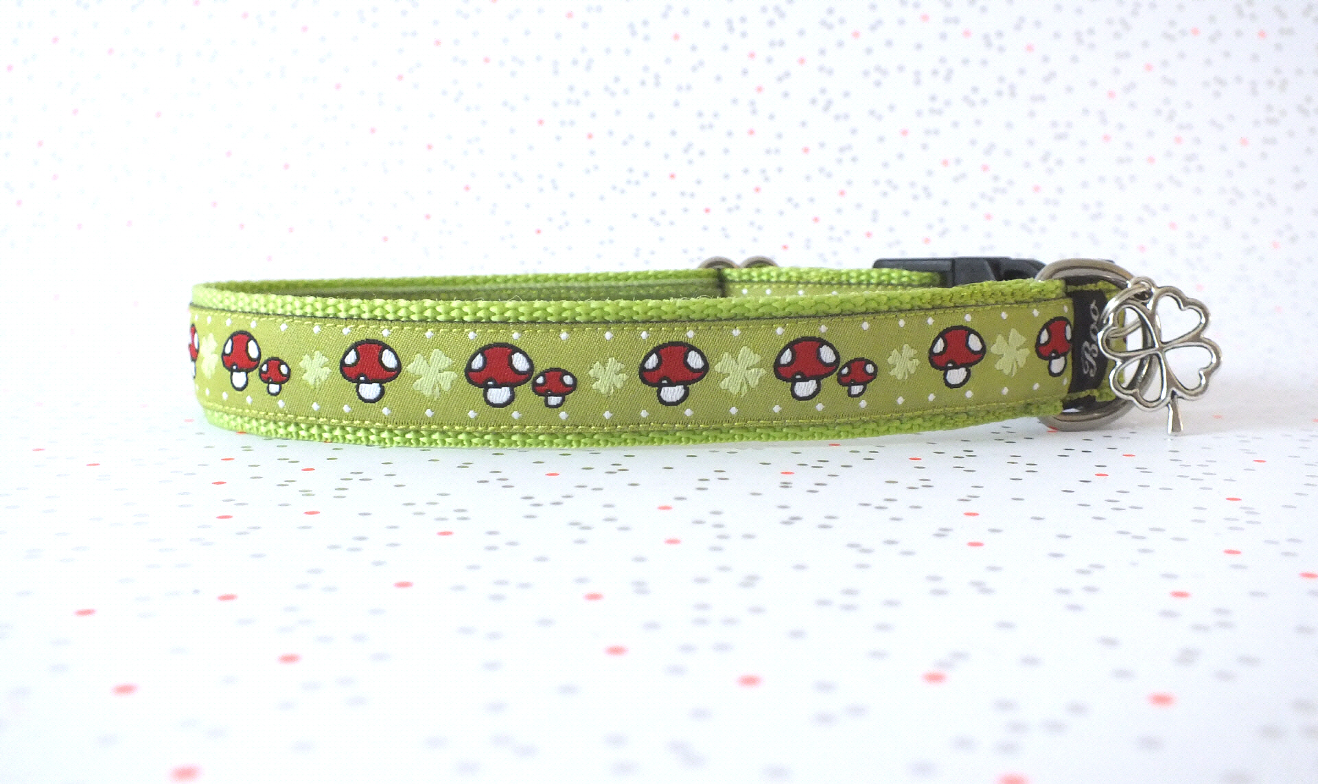 Das Halsband hat eine aufgenähte Webbordüre und eine samtig weiche Unterfütterung. Durch einen Metall Schieber ist es stufenlos größenverstellbar ohne am Hals zu verrutschen. Leicht gewölbt sorgt ein schwarzer Klickverschluss für einen guten Sitz am Hundehals. Der kleine Anhänger ist nur Tüddelkrams fürs Foto und könnte anders ausfallen. Das Material ist waschbar bis 30 Grad. Meine Empfehlung für dich ist Handwäsche um die tollen Farben und das Material zu schonen.