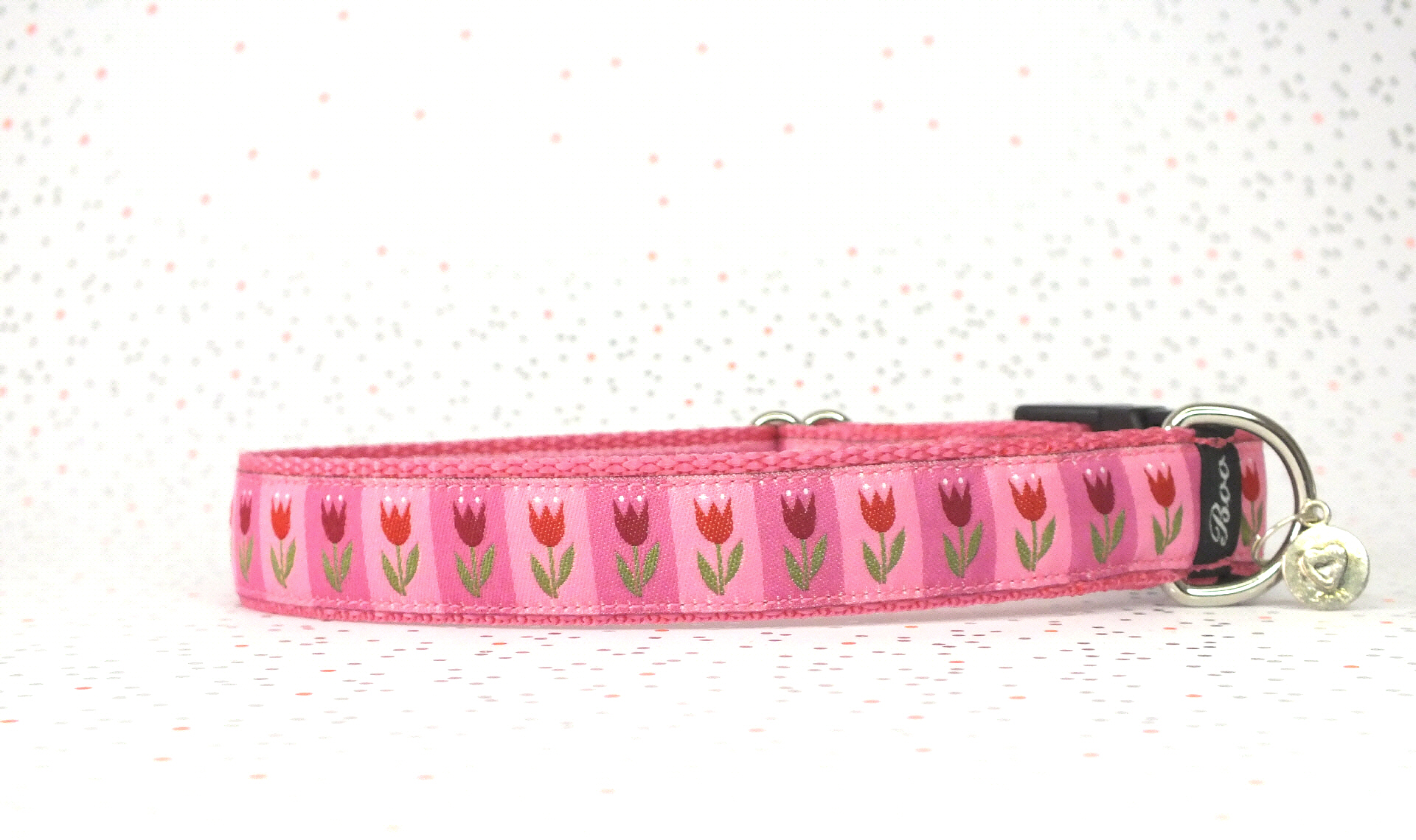 Das Halsband hat eine aufgenähte Webbordüre und eine samtig weiche Unterfütterung. Durch einen Metall Schieber ist es stufenlos größenverstellbar ohne am Hals zu verrutschen. Leicht gewölbt sorgt ein schwarzer Klickverschluss für einen guten Sitz am Hundehals. Der kleine Anhänger ist nur Tüddelkrams fürs Foto und könnte anders ausfallen. Das Material ist waschbar bis 30 Grad. Meine Empfehlung für dich ist Handwäsche um die tollen Farben und das Material zu schonen.