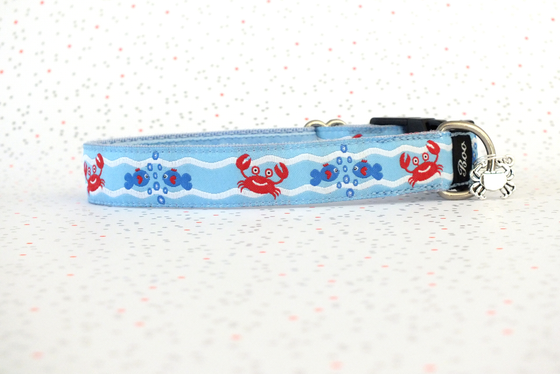 Das Halsband hat eine aufgenähte Webbordüre und eine samtig weiche Unterfütterung. Durch einen Metall Schieber ist es stufenlos größenverstellbar ohne am Hals zu verrutschen. Leicht gewölbt sorgt ein schwarzer Klickverschluss für einen guten Sitz am Hundehals. Der kleine Anhänger ist nur Tüddelkrams fürs Foto und könnte anders ausfallen. Das Material ist waschbar bis 30 Grad. Meine Empfehlung für dich ist Handwäsche um die tollen Farben und das Material zu schonen.