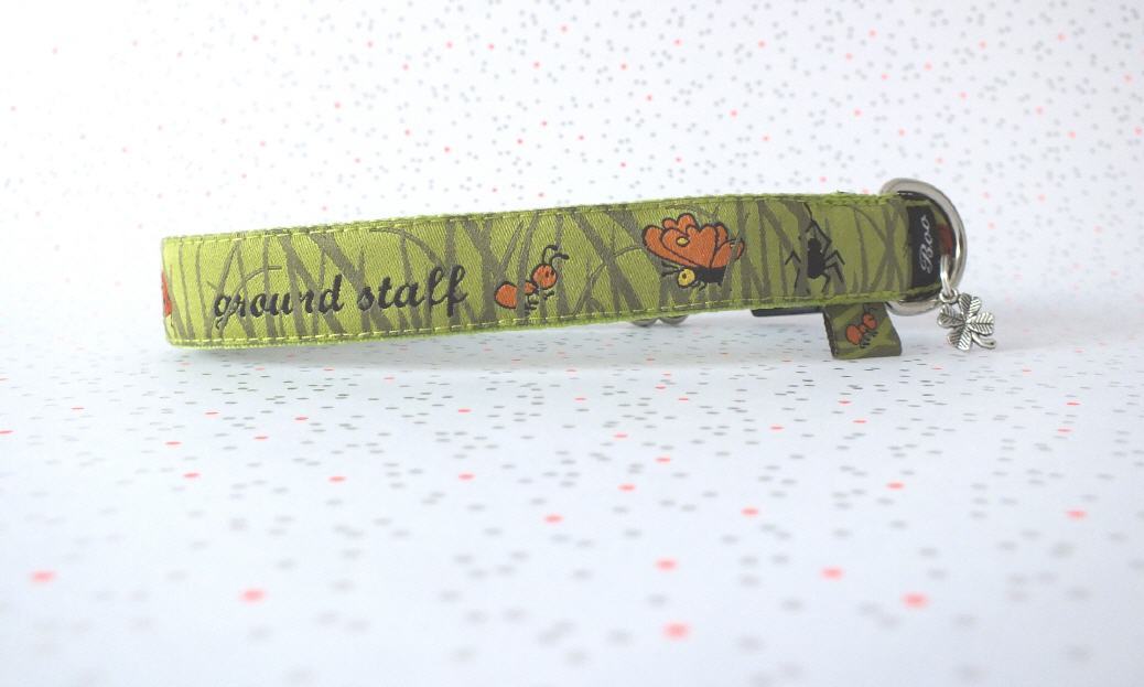Das Halsband hat eine aufgenähte Webbordüre und eine samtig weiche Unterfütterung. Durch einen Metall Schieber ist es stufenlos größenverstellbar ohne am Hals zu verrutschen. Leicht gewölbt sorgt ein schwarzer Klickverschluss für einen guten Sitz am Hundehals. Der kleine Anhänger ist nur Tüddelkrams fürs Foto und könnte anders ausfallen. Das Material ist waschbar bis 30 Grad. Meine Empfehlung für dich ist Handwäsche um die tollen Farben und das Material zu schonen.