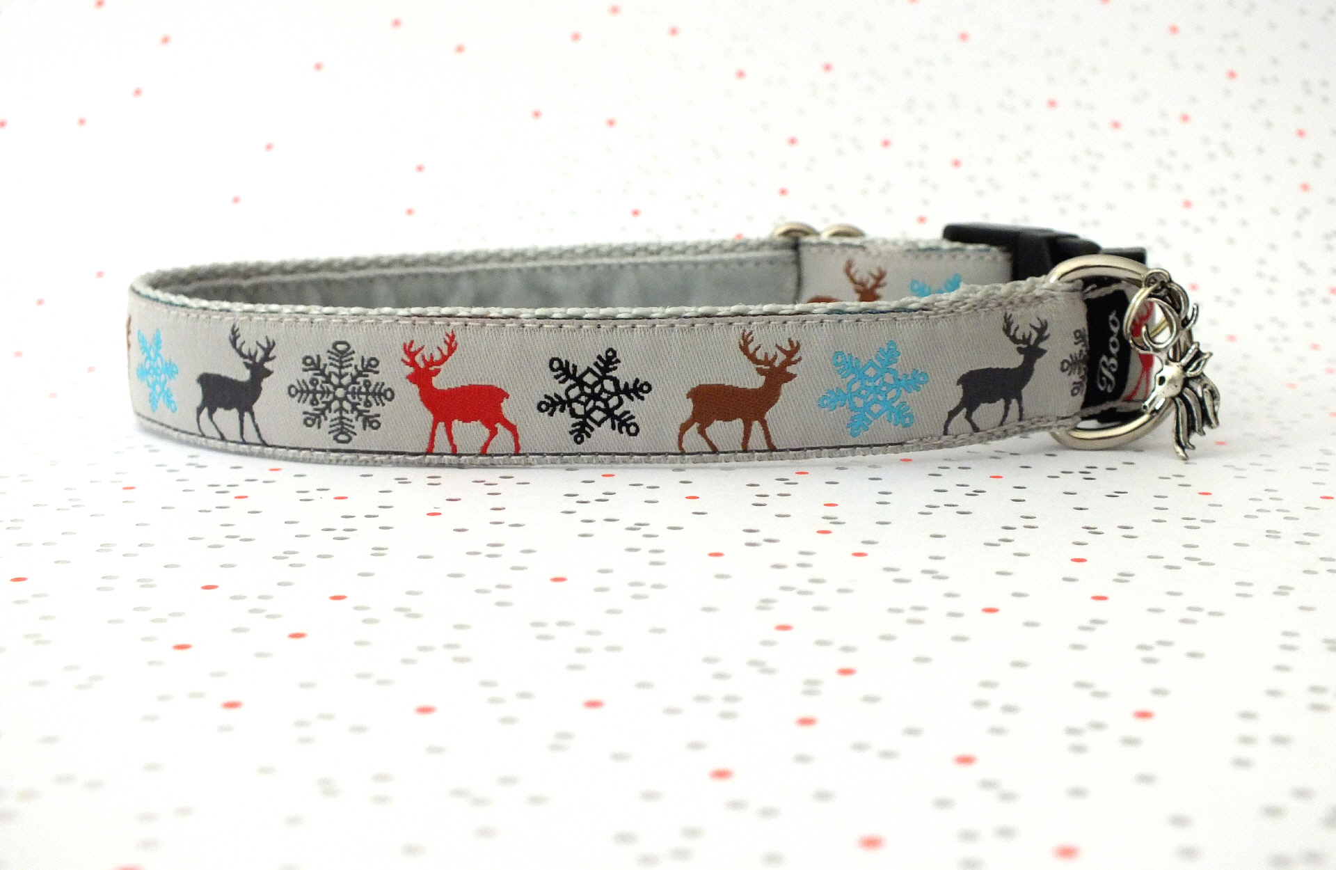Das Halsband hat eine aufgenähte Webbordüre und eine samtig weiche Unterfütterung. Durch einen Metall Schieber ist es stufenlos größenverstellbar ohne am Hals zu verrutschen. Leicht gewölbt sorgt ein schwarzer Klickverschluss für einen guten Sitz am Hundehals. Der kleine Anhänger ist nur Tüddelkrams fürs Foto und könnte anders ausfallen. Das Material ist waschbar bis 30 Grad. Meine Empfehlung für dich ist Handwäsche um die tollen Farben und das Material zu schonen.