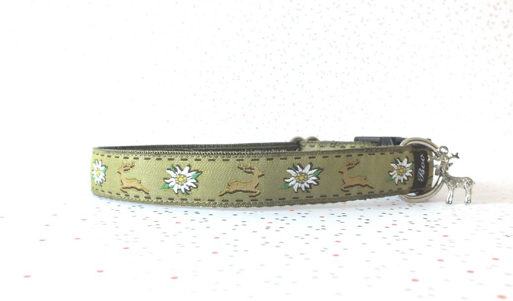Das Halsband hat eine aufgenähte Webbordüre und eine samtig weiche Unterfütterung. Durch einen Metall Schieber ist es stufenlos größenverstellbar ohne am Hals zu verrutschen. Leicht gewölbt sorgt ein schwarzer Klickverschluss für einen guten Sitz am Hundehals. Der kleine Anhänger ist nur Tüddelkrams fürs Foto und könnte anders ausfallen. Das Material ist waschbar bis 30 Grad. Meine Empfehlung für dich ist Handwäsche um die tollen Farben und das Material zu schonen.