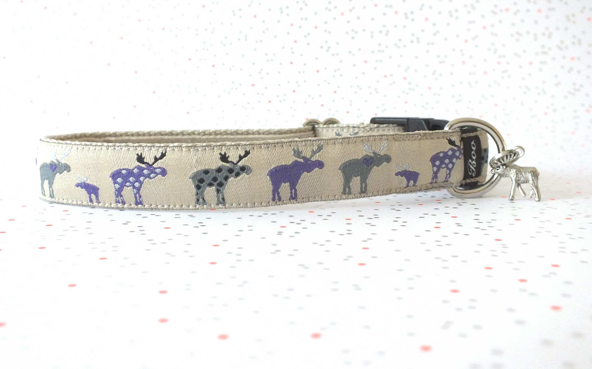 Das Halsband hat eine aufgenähte Webbordüre und eine samtig weiche Unterfütterung. Durch einen Metall Schieber ist es stufenlos größenverstellbar ohne am Hals zu verrutschen. Leicht gewölbt sorgt ein schwarzer Klickverschluss für einen guten Sitz am Hundehals. Der kleine Anhänger ist nur Tüddelkrams fürs Foto und könnte anders ausfallen. Das Material ist waschbar bis 30 Grad. Meine Empfehlung für dich ist Handwäsche um die tollen Farben und das Material zu schonen.