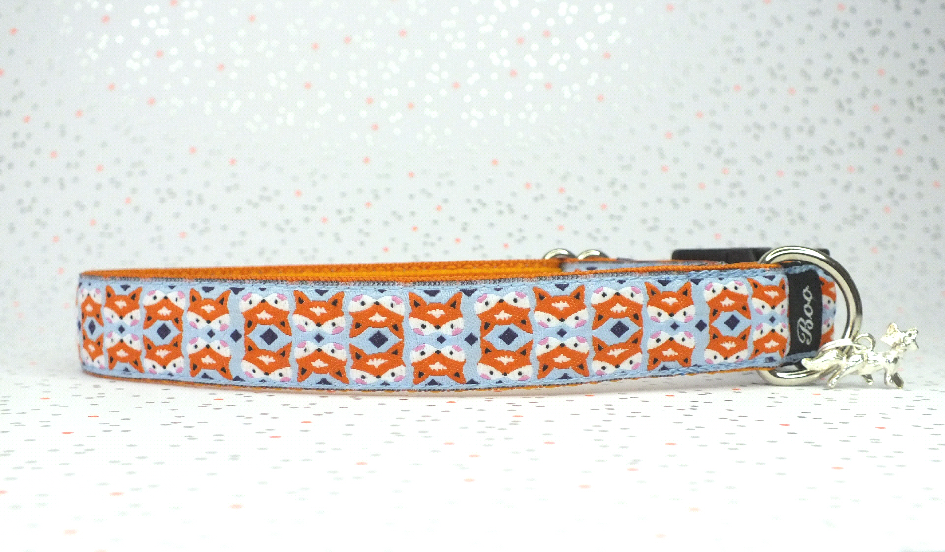 Das Halsband hat eine aufgenähte Webbordüre und eine samtig weiche Unterfütterung. Durch einen Metall Schieber ist es stufenlos größenverstellbar ohne am Hals zu verrutschen. Leicht gewölbt sorgt ein schwarzer Klickverschluss für einen guten Sitz am Hundehals. Der kleine Anhänger ist nur Tüddelkrams fürs Foto und könnte anders ausfallen. Das Material ist waschbar bis 30 Grad. Meine Empfehlung für dich ist Handwäsche um die tollen Farben und das Material zu schonen.