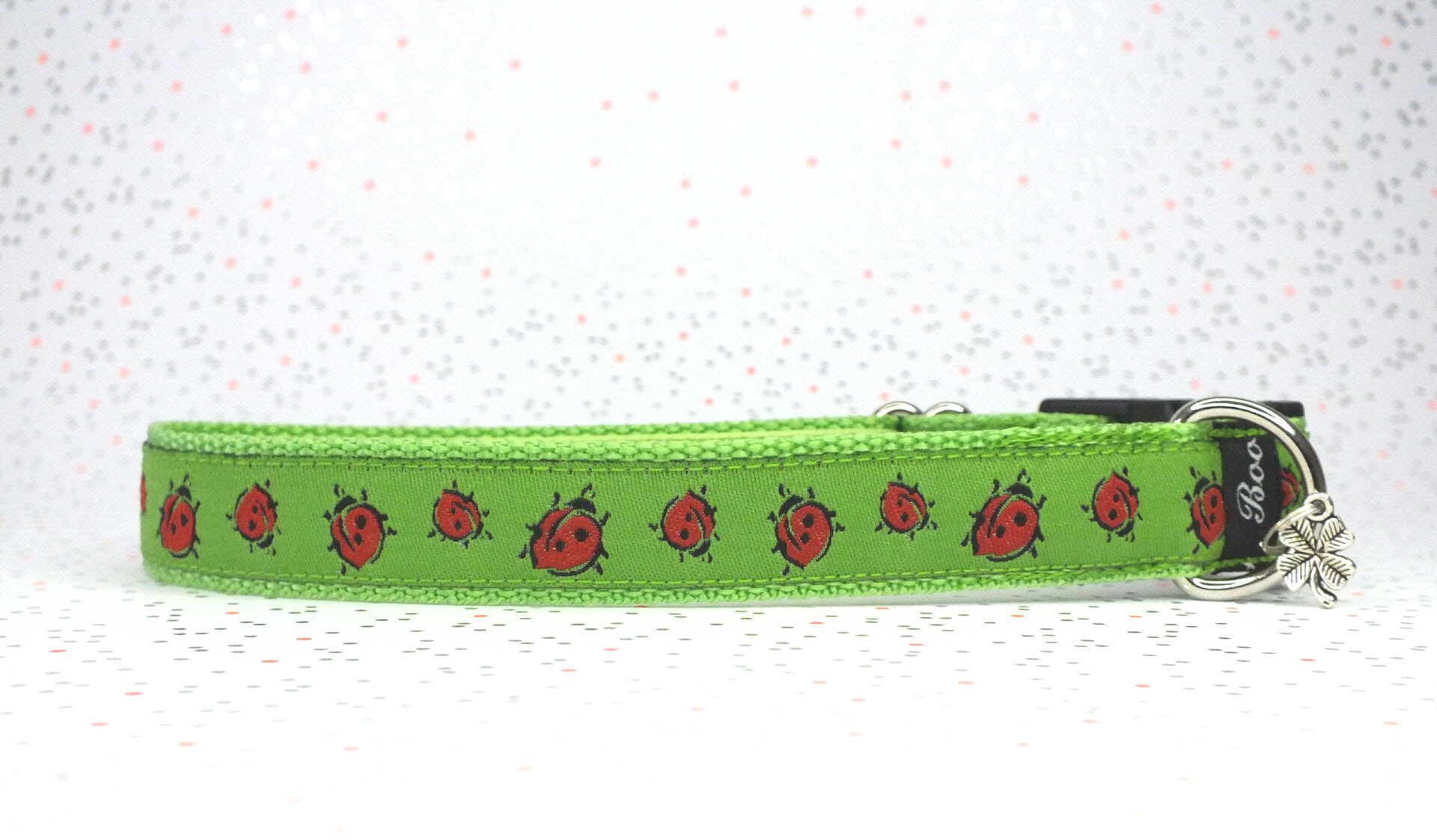 Das Halsband hat eine aufgenähte Webbordüre und eine samtig weiche Unterfütterung. Durch einen Metall Schieber ist es stufenlos größenverstellbar ohne am Hals zu verrutschen. Leicht gewölbt sorgt ein schwarzer Klickverschluss für einen guten Sitz am Hundehals. Der kleine Anhänger ist nur Tüddelkrams fürs Foto und könnte anders ausfallen. Das Material ist waschbar bis 30 Grad. Meine Empfehlung für dich ist Handwäsche um die tollen Farben und das Material zu schonen.
