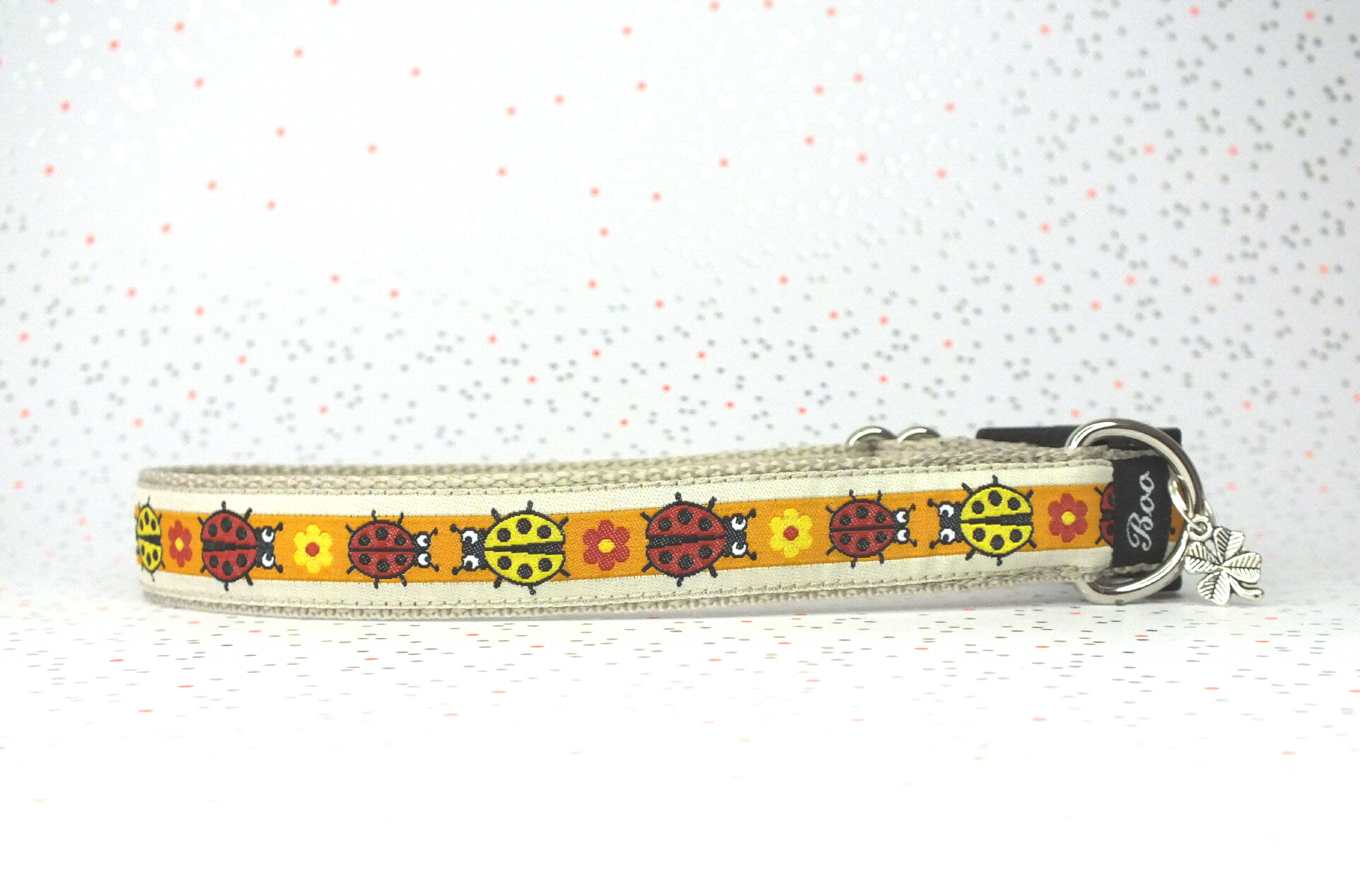 Das Halsband hat eine aufgenähte Webbordüre und eine samtig weiche Unterfütterung. Durch einen Metall Schieber ist es stufenlos größenverstellbar ohne am Hals zu verrutschen. Leicht gewölbt sorgt ein schwarzer Klickverschluss für einen guten Sitz am Hundehals. Der kleine Anhänger ist nur Tüddelkrams fürs Foto und könnte anders ausfallen. Das Material ist waschbar bis 30 Grad. Meine Empfehlung für dich ist Handwäsche um die tollen Farben und das Material zu schonen.