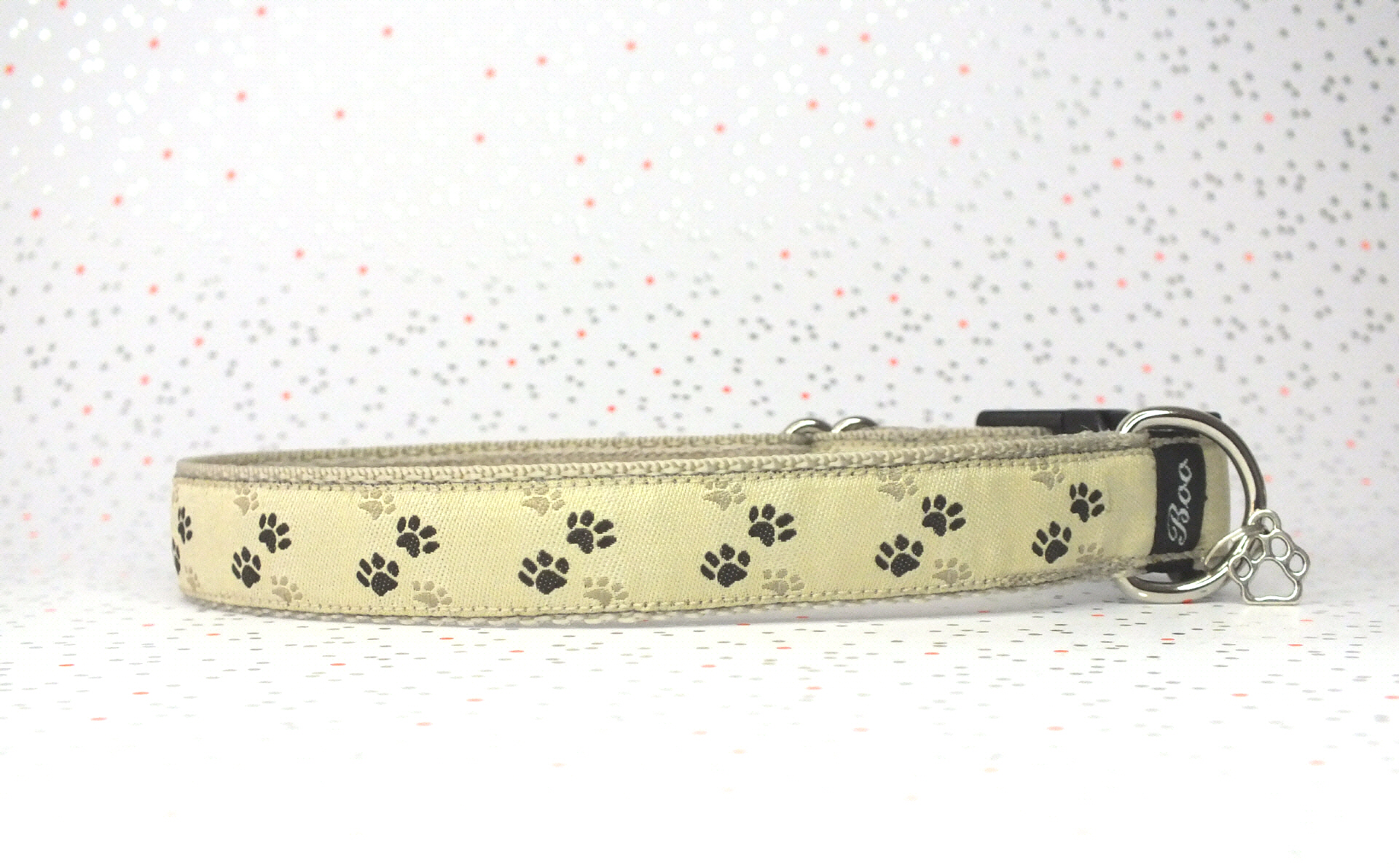 Das Halsband hat eine aufgenähte Webbordüre und eine samtig weiche Unterfütterung. Durch einen Metall Schieber ist es stufenlos größenverstellbar ohne am Hals zu verrutschen. Leicht gewölbt sorgt ein schwarzer Klickverschluss für einen guten Sitz am Hundehals. Der kleine Anhänger ist nur Tüddelkrams fürs Foto und könnte anders ausfallen. Das Material ist waschbar bis 30 Grad. Meine Empfehlung für dich ist Handwäsche um die tollen Farben und das Material zu schonen.