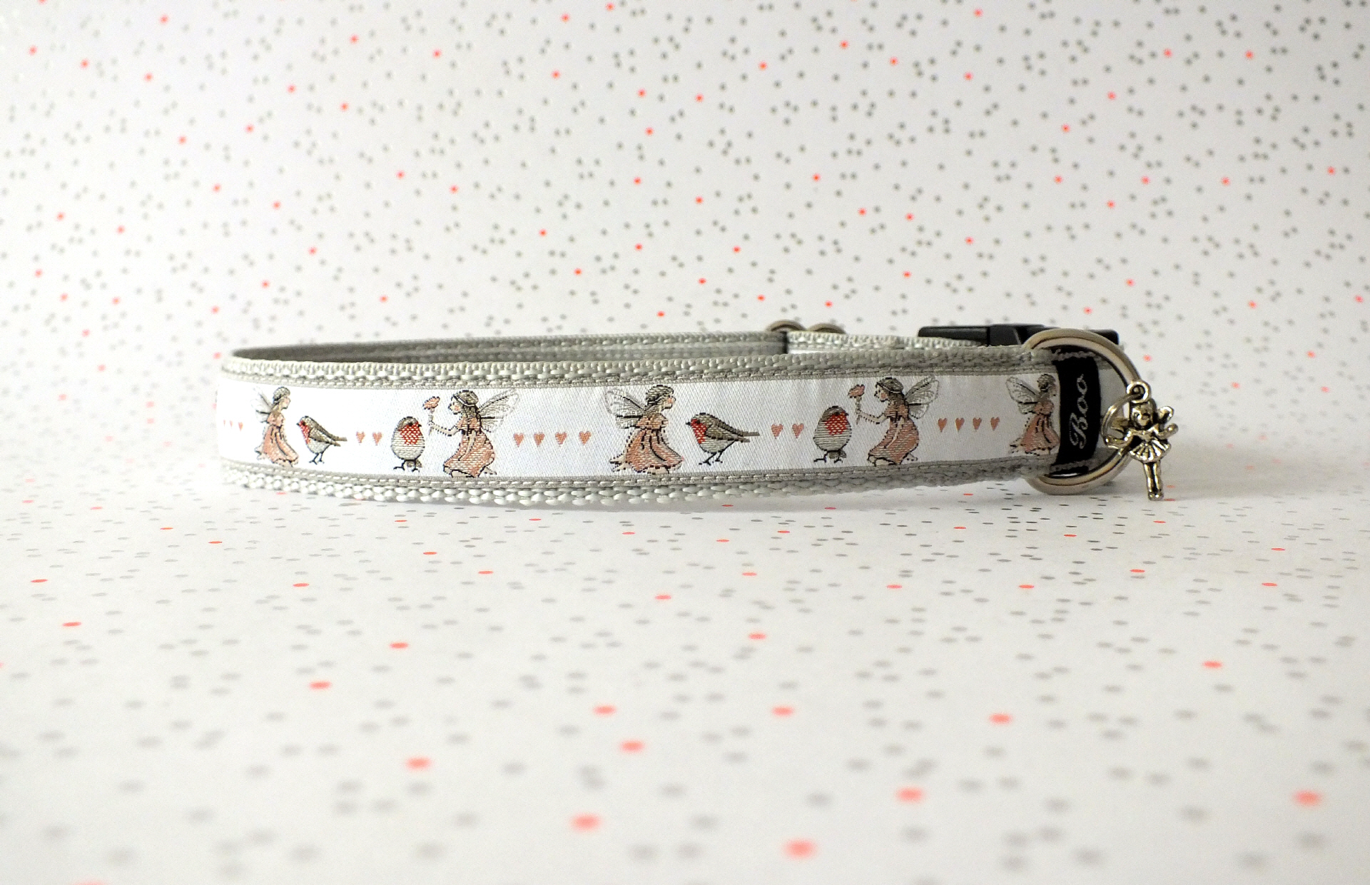 Das Halsband hat eine aufgenähte Webbordüre und eine samtig weiche Unterfütterung. Durch einen Metall Schieber ist es stufenlos größenverstellbar ohne am Hals zu verrutschen. Leicht gewölbt sorgt ein schwarzer Klickverschluss für einen guten Sitz am Hundehals. Der kleine Anhänger ist nur Tüddelkrams fürs Foto und könnte anders ausfallen. Das Material ist waschbar bis 30 Grad. Meine Empfehlung für dich ist Handwäsche um die tollen Farben und das Material zu schonen.