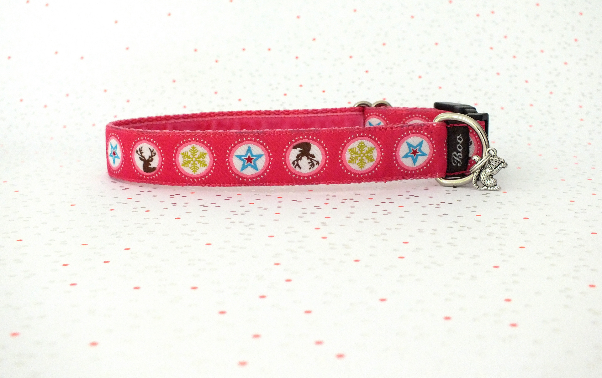 Das Halsband hat eine aufgenähte Webbordüre und eine samtig weiche Unterfütterung. Durch einen Metall Schieber ist es stufenlos größenverstellbar ohne am Hals zu verrutschen. Leicht gewölbt sorgt ein schwarzer Klickverschluss für einen guten Sitz am Hundehals. Der kleine Anhänger ist nur Tüddelkrams fürs Foto und könnte anders ausfallen. Das Material ist waschbar bis 30 Grad. Meine Empfehlung für dich ist Handwäsche um die tollen Farben und das Material zu schonen.