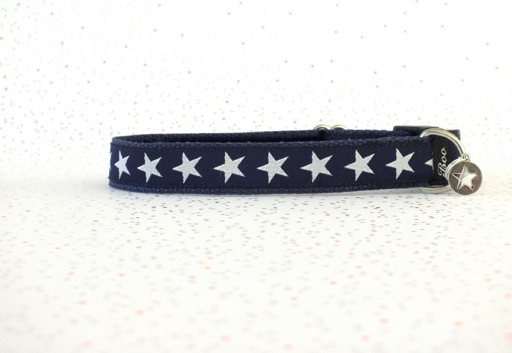 Das Halsband hat eine aufgenähte Webbordüre und eine samtig weiche Unterfütterung. Durch einen Metall Schieber ist es stufenlos größenverstellbar ohne am Hals zu verrutschen. Leicht gewölbt sorgt ein schwarzer Klickverschluss für einen guten Sitz am Hundehals. Der kleine Anhänger ist nur Tüddelkrams fürs Foto und könnte anders ausfallen. Das Material ist waschbar bis 30 Grad. Meine Empfehlung für dich ist Handwäsche um die tollen Farben und das Material zu schonen.