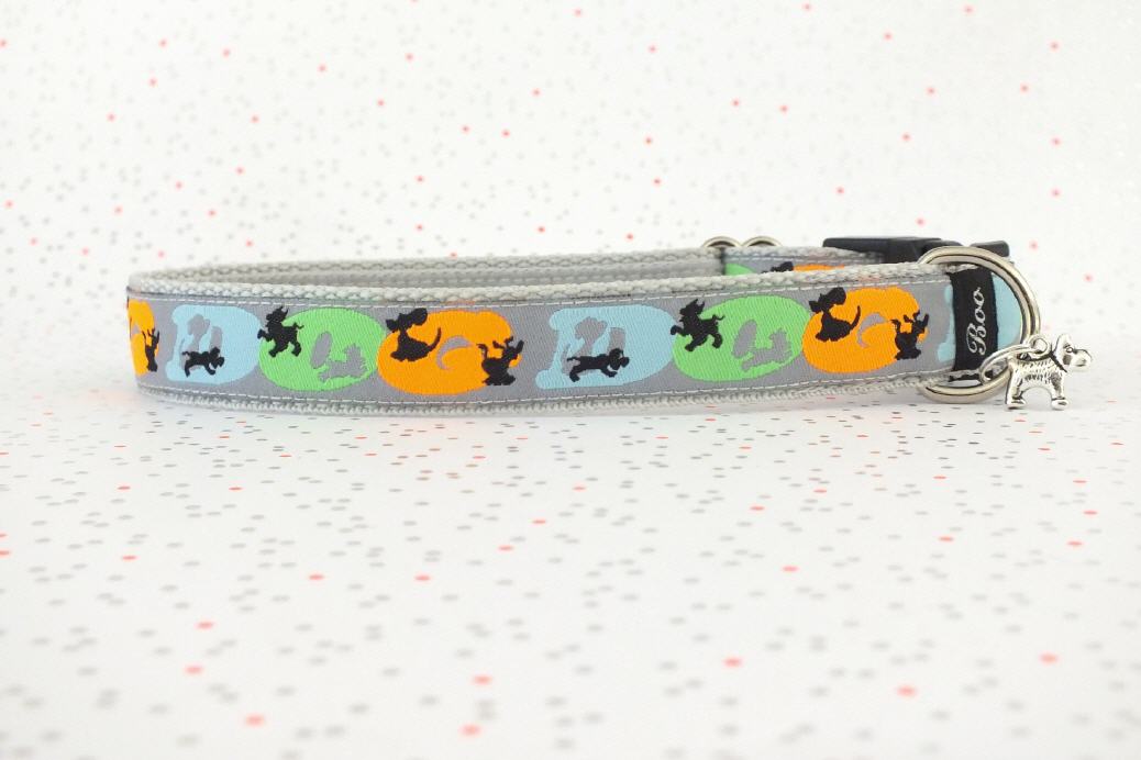 Das Halsband hat eine aufgenähte Webbordüre und eine samtig weiche Unterfütterung. Durch einen Metall Schieber ist es stufenlos größenverstellbar ohne am Hals zu verrutschen. Leicht gewölbt sorgt ein schwarzer Klickverschluss für einen guten Sitz am Hundehals. Der kleine Anhänger ist nur Tüddelkrams fürs Foto und könnte anders ausfallen. Das Material ist waschbar bis 30 Grad. Meine Empfehlung für dich ist Handwäsche um die tollen Farben und das Material zu schonen.