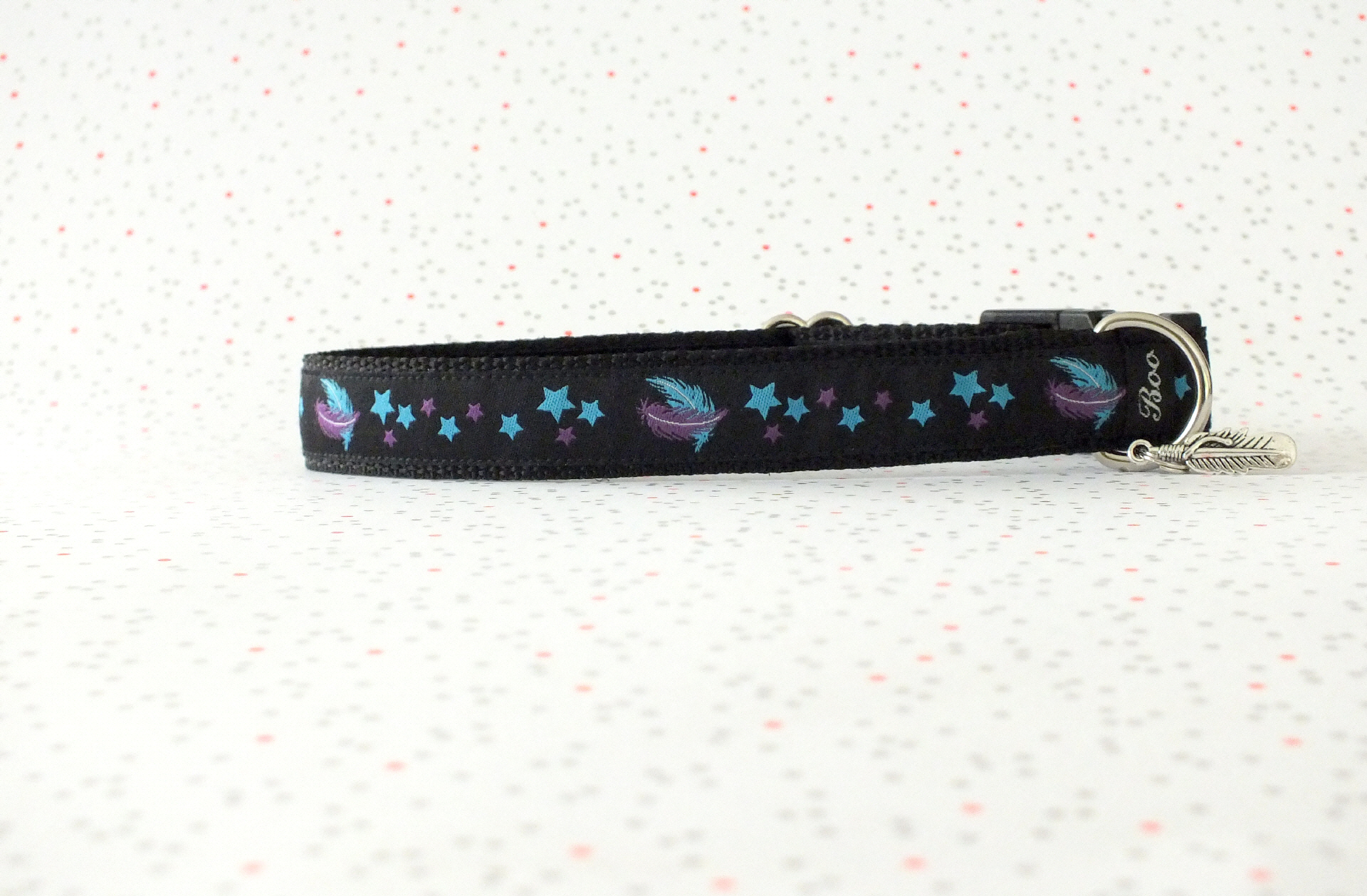 Das Halsband hat eine aufgenähte Webbordüre und eine samtig weiche Unterfütterung. Durch einen Metall Schieber ist es stufenlos größenverstellbar ohne am Hals zu verrutschen. Leicht gewölbt sorgt ein schwarzer Klickverschluss für einen guten Sitz am Hundehals. Der kleine Anhänger ist nur Tüddelkrams fürs Foto und könnte anders ausfallen. Das Material ist waschbar bis 30 Grad. Meine Empfehlung für dich ist Handwäsche um die tollen Farben und das Material zu schonen.