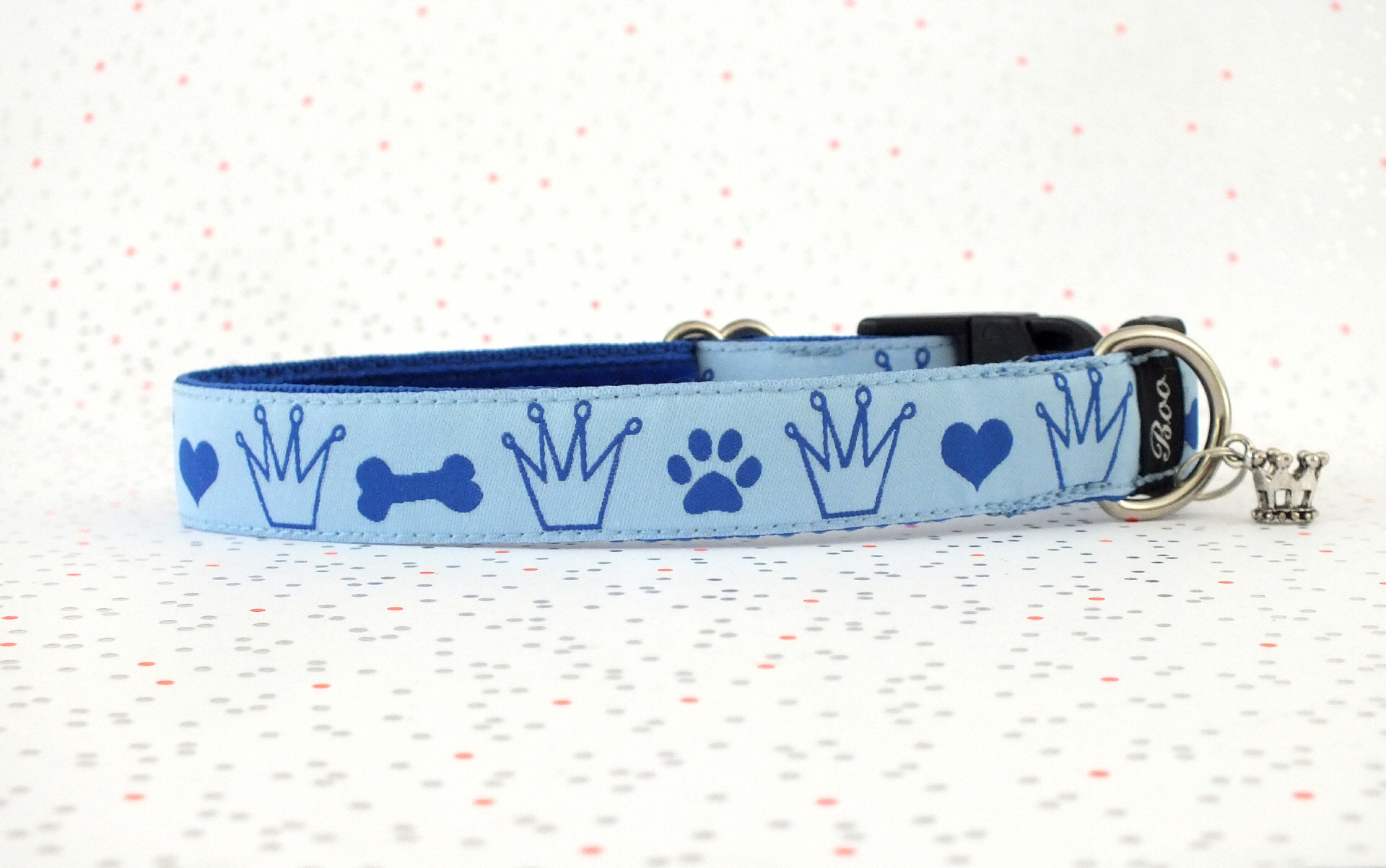 Das Halsband hat eine aufgenähte Webbordüre und eine samtig weiche Unterfütterung. Durch einen Metall Schieber ist es stufenlos größenverstellbar ohne am Hals zu verrutschen. Leicht gewölbt sorgt ein schwarzer Klickverschluss für einen guten Sitz am Hundehals. Der kleine Anhänger ist nur Tüddelkrams fürs Foto und könnte anders ausfallen. Das Material ist waschbar bis 30 Grad. Meine Empfehlung für dich ist Handwäsche um die tollen Farben und das Material zu schonen.