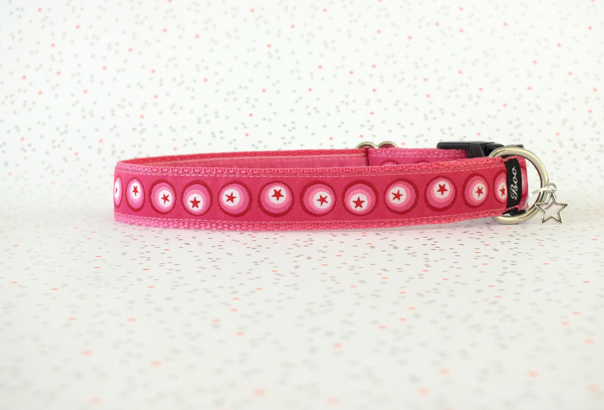 Das Halsband hat eine aufgenähte Webbordüre und eine samtig weiche Unterfütterung. Durch einen Metall Schieber ist es stufenlos größenverstellbar ohne am Hals zu verrutschen. Leicht gewölbt sorgt ein schwarzer Klickverschluss für einen guten Sitz am Hundehals. Der kleine Anhänger ist nur Tüddelkrams fürs Foto und könnte anders ausfallen. Das Material ist waschbar bis 30 Grad. Meine Empfehlung für dich ist Handwäsche um die tollen Farben und das Material zu schonen.