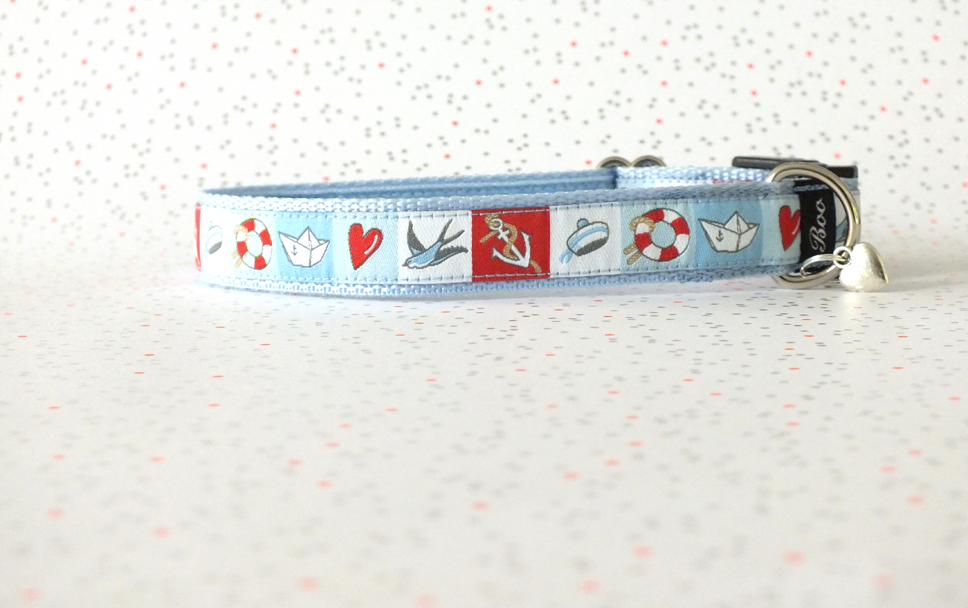 Das Halsband hat eine aufgenähte Webbordüre und eine samtig weiche Unterfütterung. Durch einen Metall Schieber ist es stufenlos größenverstellbar ohne am Hals zu verrutschen. Leicht gewölbt sorgt ein schwarzer Klickverschluss für einen guten Sitz am Hundehals. Der kleine Anhänger ist nur Tüddelkrams fürs Foto und könnte anders ausfallen. Das Material ist waschbar bis 30 Grad. Meine Empfehlung für dich ist Handwäsche um die tollen Farben und das Material zu schonen.