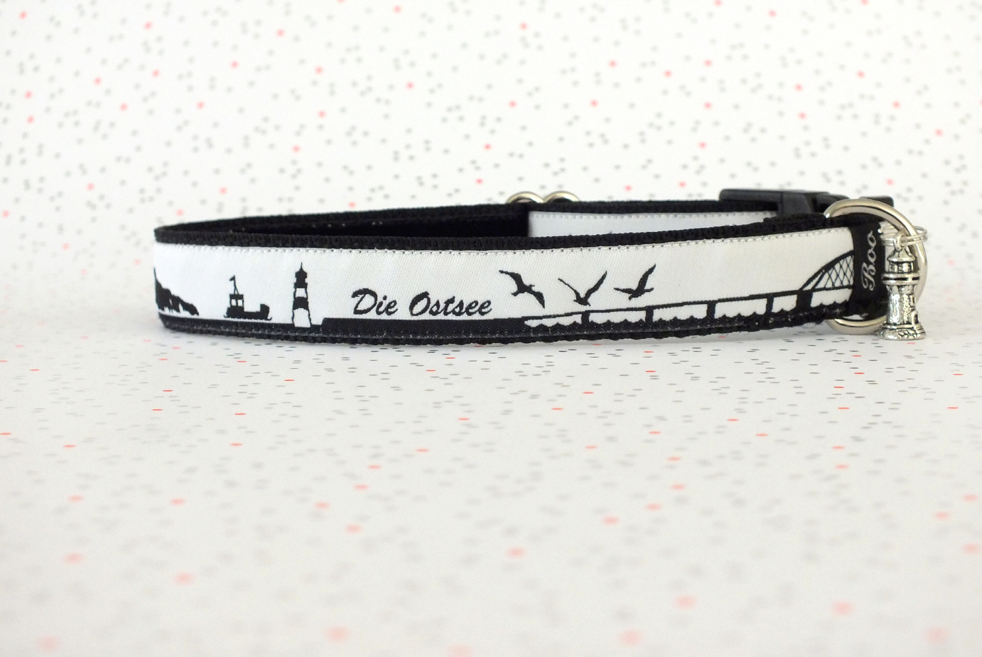 Das Halsband hat eine aufgenähte Webbordüre und eine samtig weiche Unterfütterung. Durch einen Metall Schieber ist es stufenlos größenverstellbar ohne am Hals zu verrutschen. Leicht gewölbt sorgt ein schwarzer Klickverschluss für einen guten Sitz am Hundehals. Der kleine Anhänger ist nur Tüddelkrams fürs Foto und könnte anders ausfallen. Das Material ist waschbar bis 30 Grad. Meine Empfehlung für dich ist Handwäsche um die tollen Farben und das Material zu schonen.