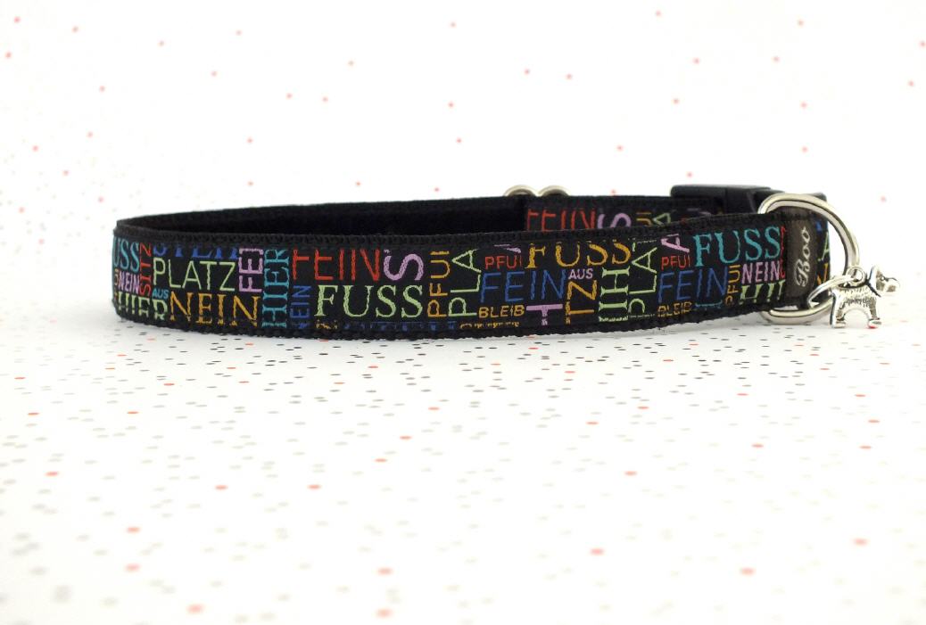 Das Halsband hat eine aufgenähte Webbordüre und eine samtig weiche Unterfütterung. Durch einen Metall Schieber ist es stufenlos größenverstellbar ohne am Hals zu verrutschen. Leicht gewölbt sorgt ein schwarzer Klickverschluss für einen guten Sitz am Hundehals. Der kleine Anhänger ist nur Tüddelkrams fürs Foto und könnte anders ausfallen. Das Material ist waschbar bis 30 Grad. Meine Empfehlung für dich ist Handwäsche um die tollen Farben und das Material zu schonen.