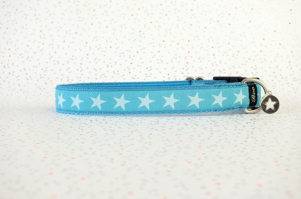 Das Halsband hat eine aufgenähte Webbordüre und eine samtig weiche Unterfütterung. Durch einen Metall Schieber ist es stufenlos größenverstellbar ohne am Hals zu verrutschen. Leicht gewölbt sorgt ein schwarzer Klickverschluss für einen guten Sitz am Hundehals. Der kleine Anhänger ist nur Tüddelkrams fürs Foto und könnte anders ausfallen. Das Material ist waschbar bis 30 Grad. Meine Empfehlung für dich ist Handwäsche um die tollen Farben und das Material zu schonen.