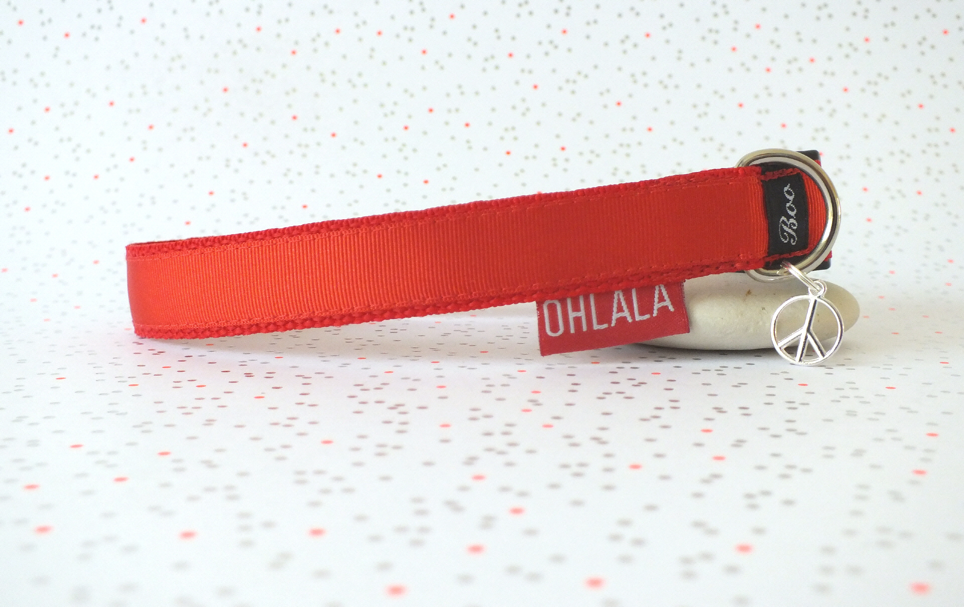 Das Halsband hat eine aufgenähte Webbordüre und eine samtig weiche Unterfütterung. Durch einen Metall Schieber ist es stufenlos größenverstellbar ohne am Hals zu verrutschen. Leicht gewölbt sorgt ein schwarzer Klickverschluss für einen guten Sitz am Hundehals. Der kleine Anhänger ist nur Tüddelkrams fürs Foto und könnte anders ausfallen. Das Material ist waschbar bis 30 Grad. Meine Empfehlung für dich ist Handwäsche um die tollen Farben und das Material zu schonen.