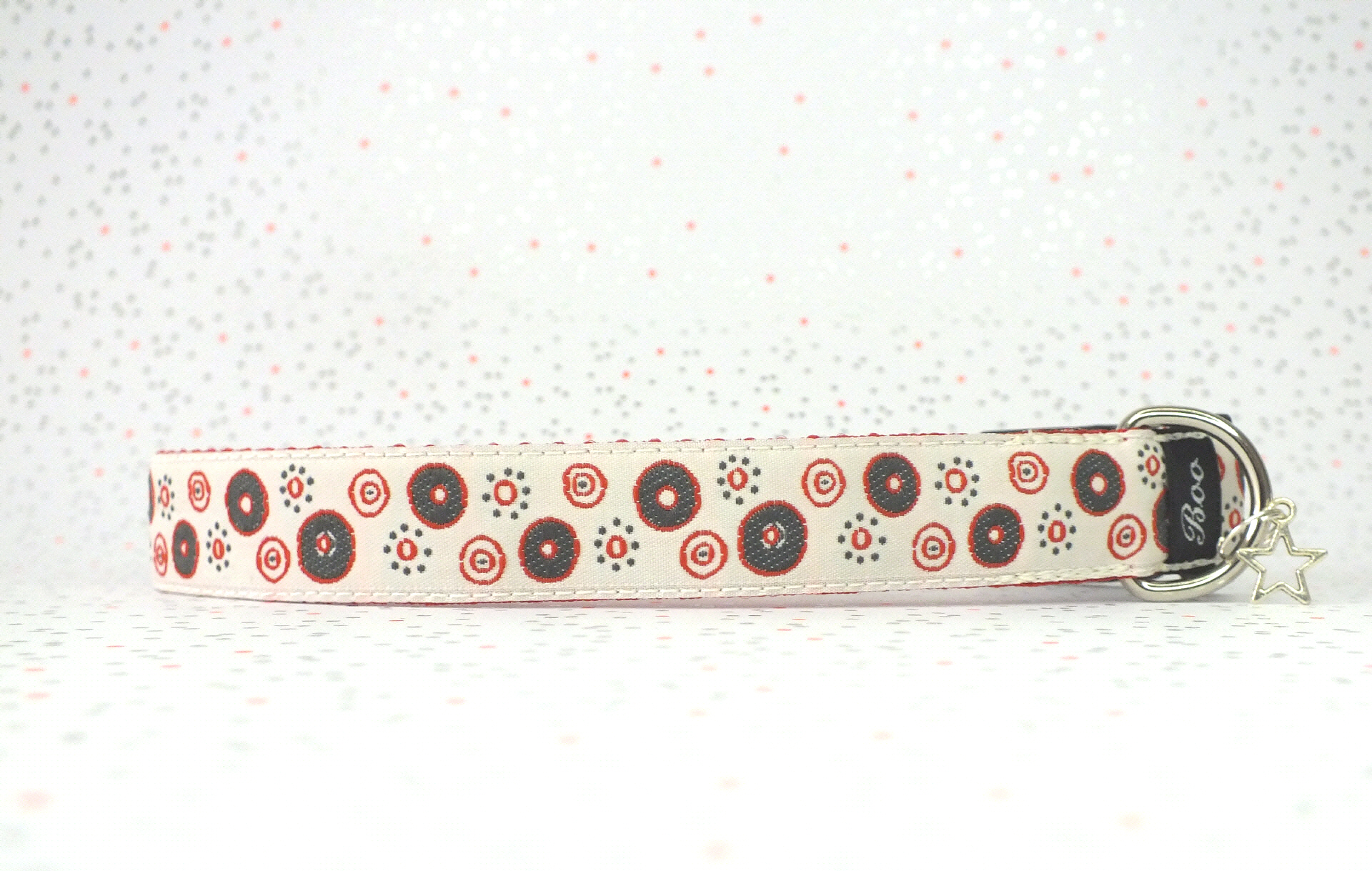 Das Halsband hat eine aufgenähte Webbordüre und eine samtig weiche Unterfütterung. Durch einen Metall Schieber ist es stufenlos größenverstellbar ohne am Hals zu verrutschen. Leicht gewölbt sorgt ein schwarzer Klickverschluss für einen guten Sitz am Hundehals. Der kleine Anhänger ist nur Tüddelkrams fürs Foto und könnte anders ausfallen. Das Material ist waschbar bis 30 Grad. Meine Empfehlung für dich ist Handwäsche um die tollen Farben und das Material zu schonen.
