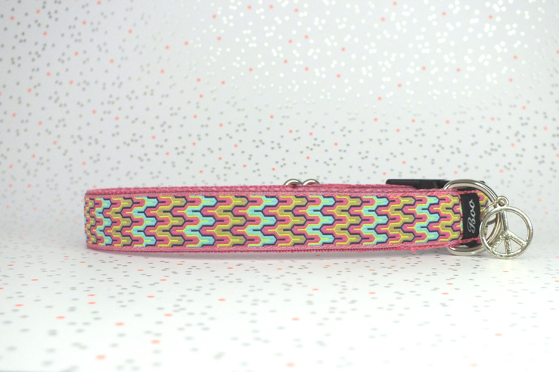 Das Halsband hat eine aufgenähte Webbordüre und eine samtig weiche Unterfütterung. Durch einen Metall Schieber ist es stufenlos größenverstellbar ohne am Hals zu verrutschen. Leicht gewölbt sorgt ein schwarzer Klickverschluss für einen guten Sitz am Hundehals. Der kleine Anhänger ist nur Tüddelkrams fürs Foto und könnte anders ausfallen. Das Material ist waschbar bis 30 Grad. Meine Empfehlung für dich ist Handwäsche um die tollen Farben und das Material zu schonen.