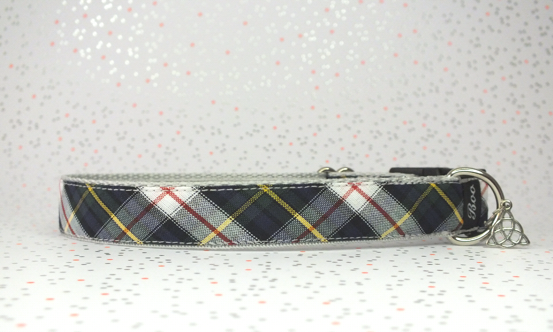 Das Halsband hat eine aufgenähte Webbordüre und eine samtig weiche Unterfütterung. Durch einen Metall Schieber ist es stufenlos größenverstellbar ohne am Hals zu verrutschen. Leicht gewölbt sorgt ein schwarzer Klickverschluss für einen guten Sitz am Hundehals. Der kleine Anhänger ist nur Tüddelkrams fürs Foto und könnte anders ausfallen. Das Material ist waschbar bis 30 Grad. Meine Empfehlung für dich ist Handwäsche um die tollen Farben und das Material zu schonen.