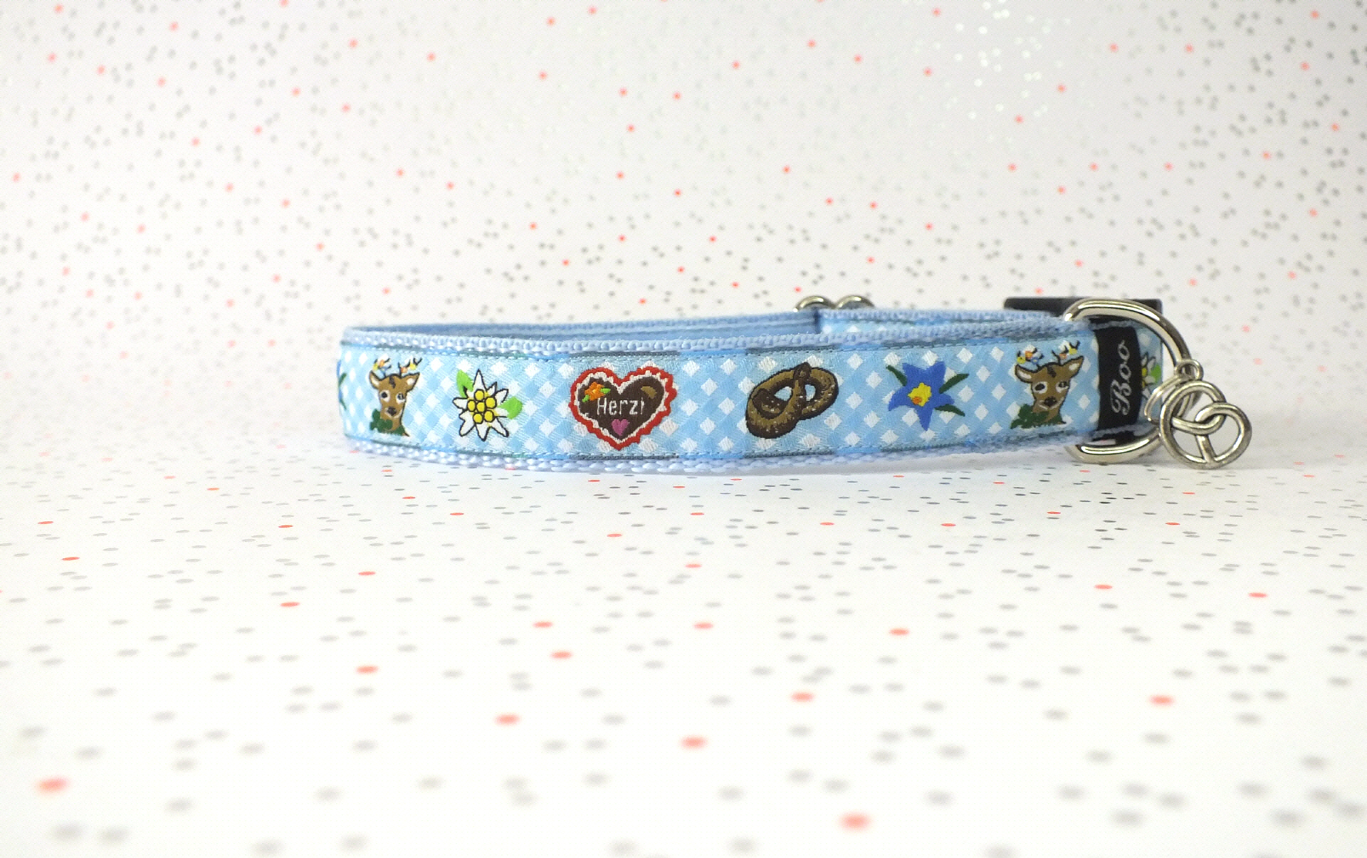 Das Halsband hat eine aufgenähte Webbordüre und eine samtig weiche Unterfütterung. Durch einen Metall Schieber ist es stufenlos größenverstellbar ohne am Hals zu verrutschen. Leicht gewölbt sorgt ein schwarzer Klickverschluss für einen guten Sitz am Hundehals. Der kleine Anhänger ist nur Tüddelkrams fürs Foto und könnte anders ausfallen. Das Material ist waschbar bis 30 Grad. Meine Empfehlung für dich ist Handwäsche um die tollen Farben und das Material zu schonen.