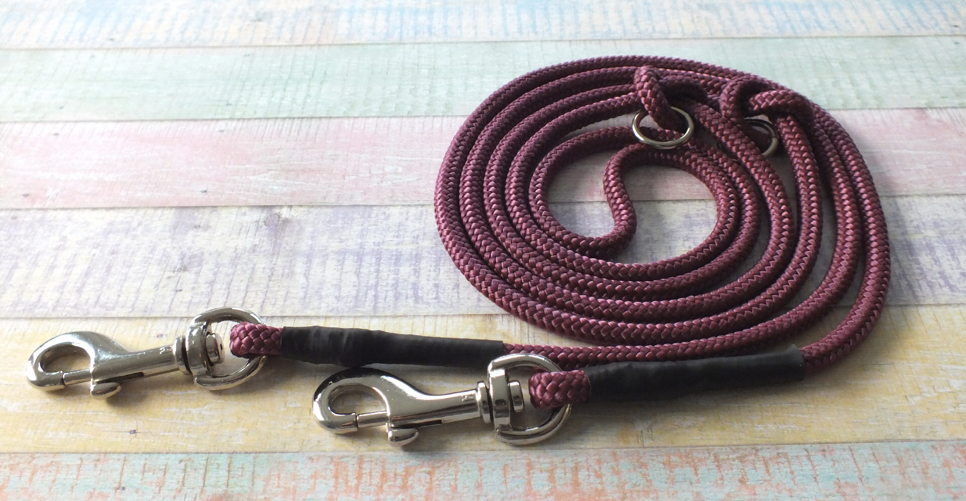 Die Rundleine Ganove hat tolle Farben die mit den Halsbändern von Boo's Halsbändern harmonieren, sie ist aus PPM liegt gut in der Hand und hat ein geringes Gewicht. Durch zwei eingeknotete Rundringe ist die Leine mehrfach verstellbar und du kannst diese auf deine persönlichen Wunschlängen einstellen. Die Gesamtlänge der Leinen gilt von Anfang bis Ende der Karabiner. Der Ganove wird von mir sorgfältig vernäht, die Naht wird mit einer Gummierun geschützt. Die Leine ist waschbar bis 30 Grad; meine Empfehlung ist Handwäsche, um die Materialien zu schonen.