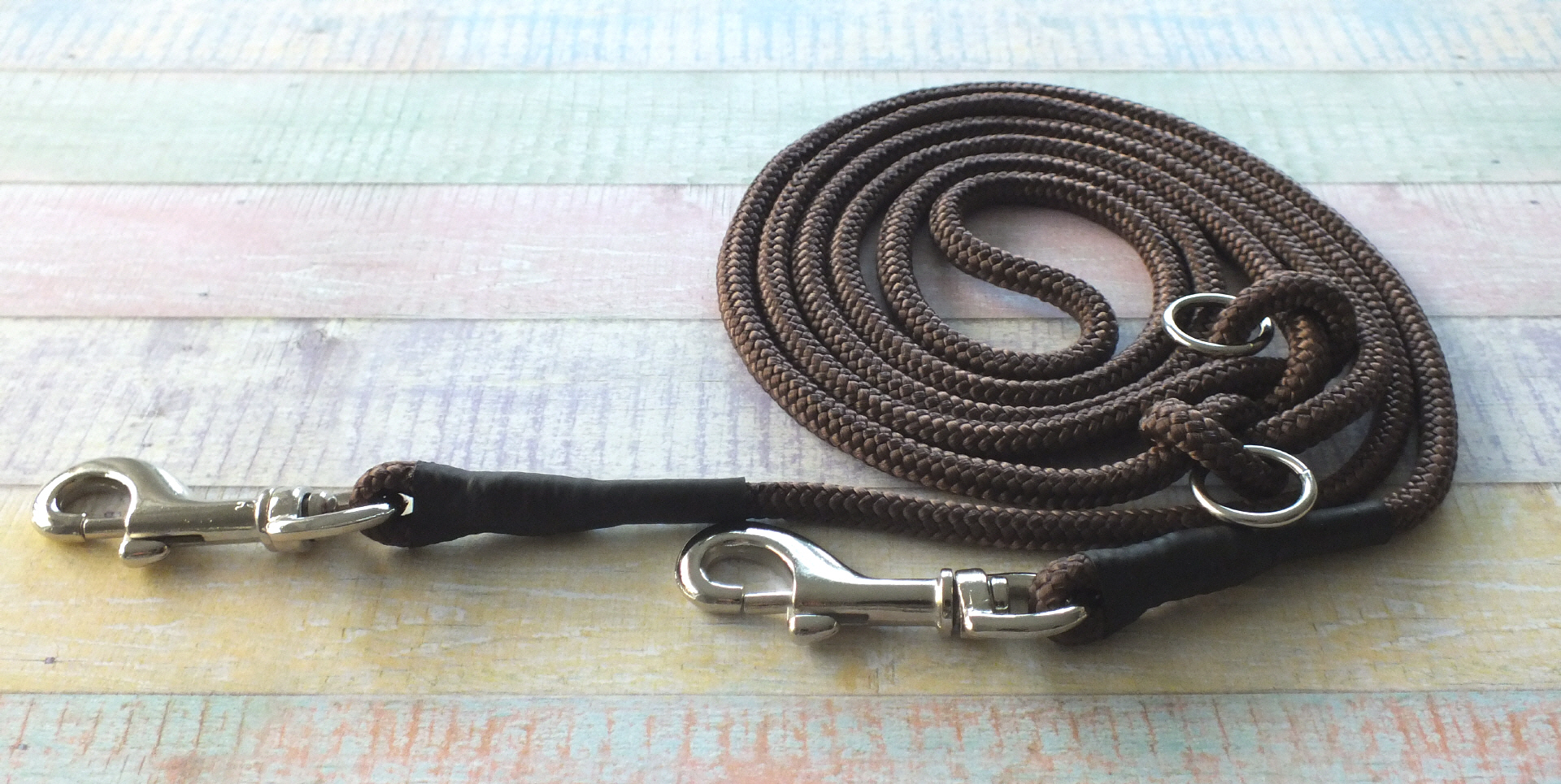 Die Rundleine Ganove hat tolle Farben die mit den Halsbändern von Boo's Halsbändern harmonieren, sie ist aus PPM liegt gut in der Hand und hat ein geringes Gewicht. Durch zwei eingeknotete Rundringe ist die Leine mehrfach verstellbar und du kannst diese auf deine persönlichen Wunschlängen einstellen. Die Gesamtlänge der Leinen gilt von Anfang bis Ende der Karabiner. Der Ganove wird von mir sorgfältig vernäht, die Naht wird mit einer Gummierun geschützt. Die Leine ist waschbar bis 30 Grad; meine Empfehlung ist Handwäsche, um die Materialien zu schonen.