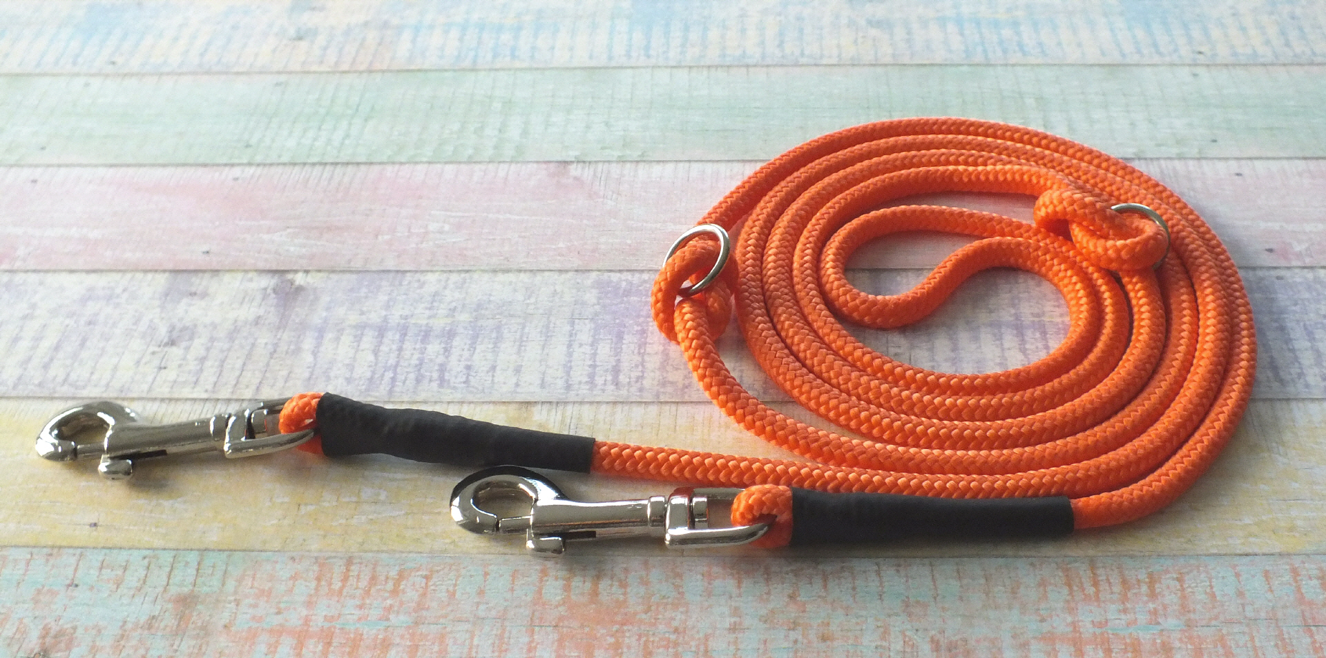 Die Rundleine Ganove hat tolle Farben die mit den Halsbändern von Boo's Halsbändern harmonieren, sie ist aus PPM liegt gut in der Hand und hat ein geringes Gewicht. Durch zwei eingeknotete Rundringe ist die Leine mehrfach verstellbar und du kannst diese auf deine persönlichen Wunschlängen einstellen. Die Gesamtlänge der Leinen gilt von Anfang bis Ende der Karabiner. Der Ganove wird von mir sorgfältig vernäht, die Naht wird mit einer Gummierun geschützt. Die Leine ist waschbar bis 30 Grad; meine Empfehlung ist Handwäsche, um die Materialien zu schonen.