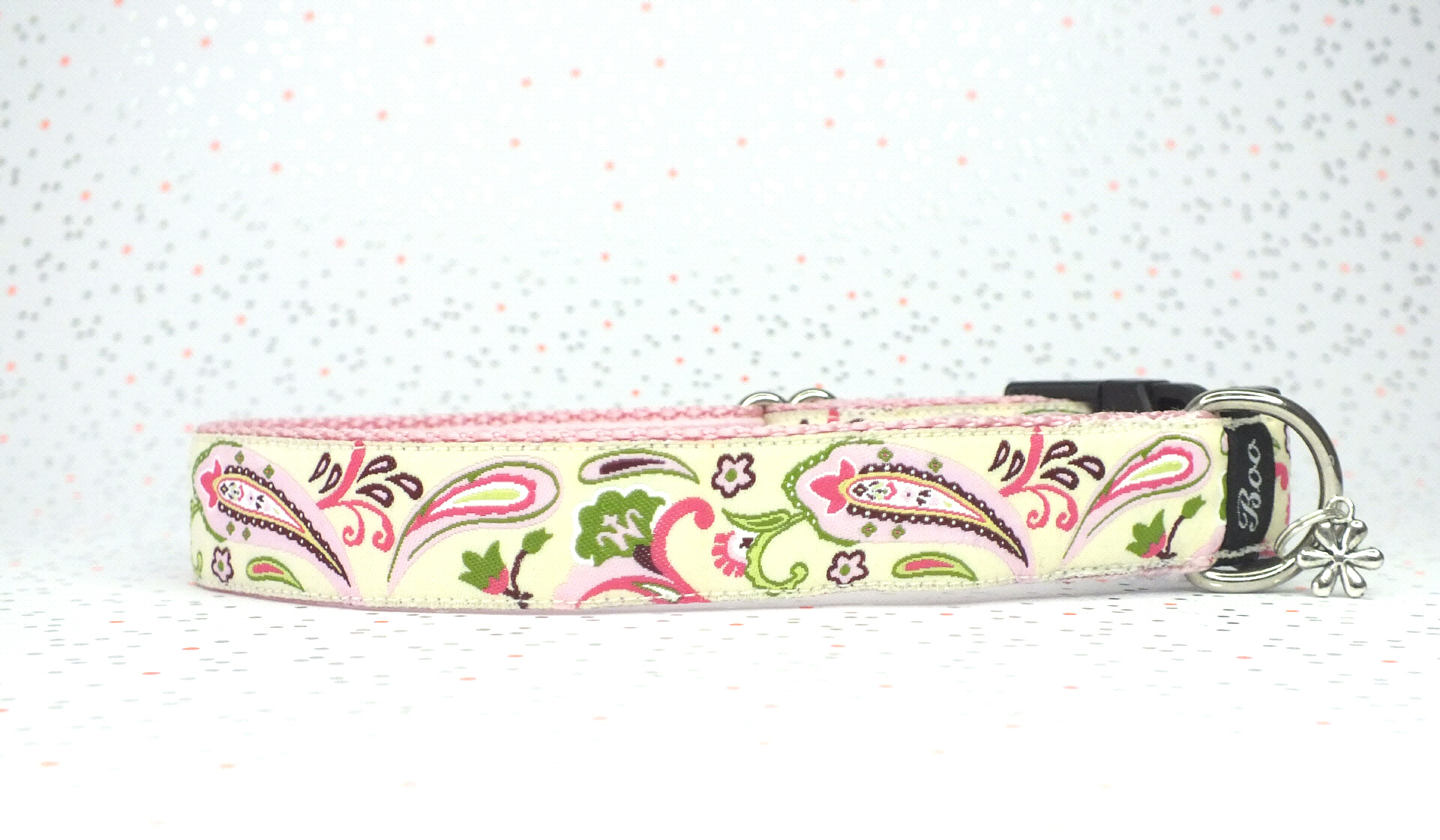 Das Halsband hat eine aufgenähte Webbordüre und eine samtig weiche Unterfütterung. Durch einen Metall Schieber ist es stufenlos größenverstellbar ohne am Hals zu verrutschen. Leicht gewölbt sorgt ein schwarzer Klickverschluss für einen guten Sitz am Hundehals. Der kleine Anhänger ist nur Tüddelkrams fürs Foto und könnte anders ausfallen. Das Material ist waschbar bis 30 Grad. Meine Empfehlung für dich ist Handwäsche um die tollen Farben und das Material zu schonen.