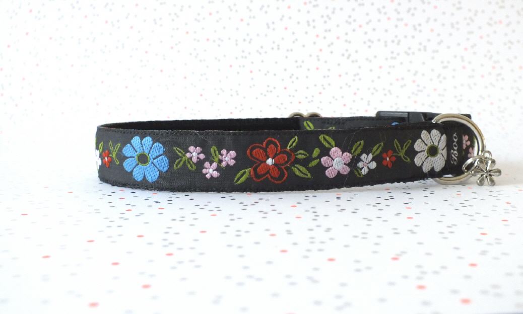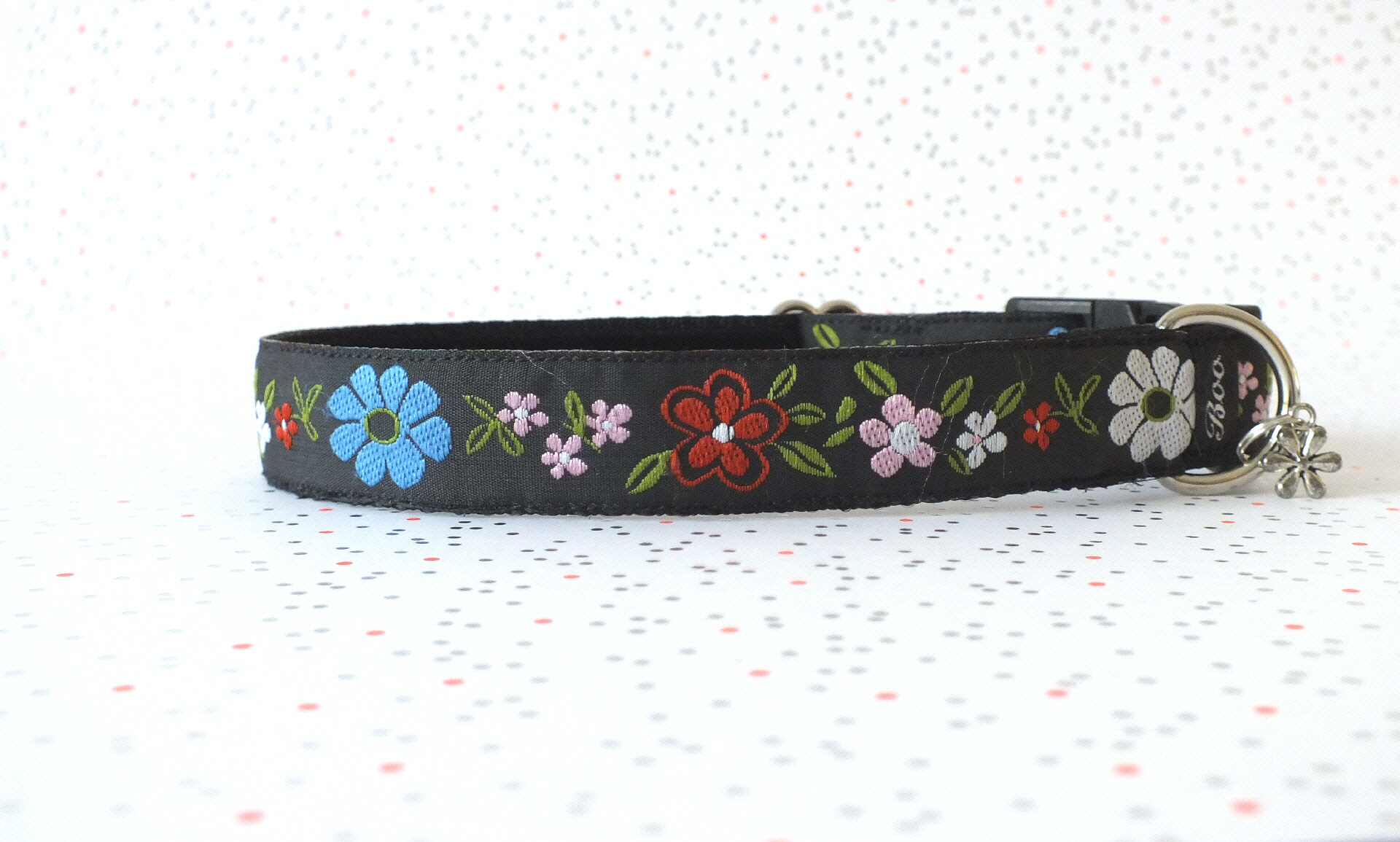 Halsband mit einer aufgenähten Webbordüre und einer samtig weichen Unterfütterung. Durch einen Metall Schieber ist das Halsband stufenlos größenverstellbar von ca. 19-30 cm oder ca. 22-35 cm ohne am Hals zu verrutschen. Leicht gewölbt sorgt ein schwarzer Klickverschluss für einen guten Sitz am Hundehals. Oft als Variante auch mit einem Aluverschluss oder als Zugstopp Halsband möglich. Die Auswahl findest du unten. Der kleine Anhänger ist nur Tüddelkrams fürs Foto und kann bei Nichtgefallen ganz leicht von dir abgemacht werden. Das Halsband ist waschbar bis 30 Grad. Meine Empfehlung für dich ist Handwäsche um die tollen Farben und das Material zu schonen. Weitere Infos zum Halsband findest auf der Infoseite.