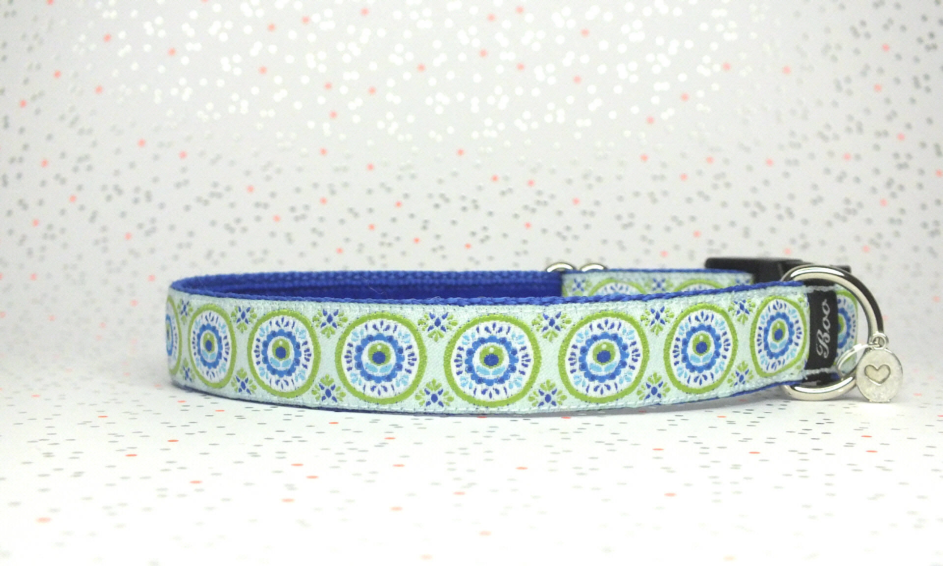 Das Halsband hat eine aufgenähte Webbordüre und eine samtig weiche Unterfütterung. Durch einen Metall Schieber ist es stufenlos größenverstellbar ohne am Hals zu verrutschen. Leicht gewölbt sorgt ein schwarzer Klickverschluss für einen guten Sitz am Hundehals. Der kleine Anhänger ist nur Tüddelkrams fürs Foto und könnte anders ausfallen. Das Material ist waschbar bis 30 Grad. Meine Empfehlung für dich ist Handwäsche um die tollen Farben und das Material zu schonen.