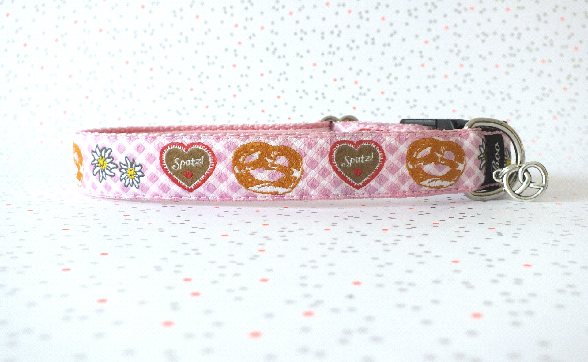 Das Halsband hat eine aufgenähte Webbordüre und eine samtig weiche Unterfütterung. Durch einen Metall Schieber ist es stufenlos größenverstellbar ohne am Hals zu verrutschen. Leicht gewölbt sorgt ein schwarzer Klickverschluss für einen guten Sitz am Hundehals. Der kleine Anhänger ist nur Tüddelkrams fürs Foto und könnte anders ausfallen. Das Material ist waschbar bis 30 Grad. Meine Empfehlung für dich ist Handwäsche um die tollen Farben und das Material zu schonen.