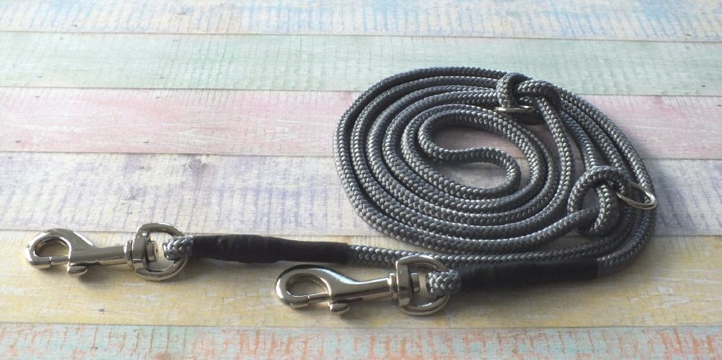 Die Rundleine Ganove hat tolle Farben die mit den Halsbändern von Boo's Halsbändern harmonieren, sie ist aus PPM liegt gut in der Hand und hat ein geringes Gewicht. Durch zwei eingeknotete Rundringe ist die Leine mehrfach verstellbar und du kannst diese auf deine persönlichen Wunschlängen einstellen. Die Gesamtlänge der Leinen gilt von Anfang bis Ende der Karabiner. Der Ganove wird von mir sorgfältig vernäht, die Naht wird mit einer Gummierun geschützt. Die Leine ist waschbar bis 30 Grad; meine Empfehlung ist Handwäsche, um die Materialien zu schonen.